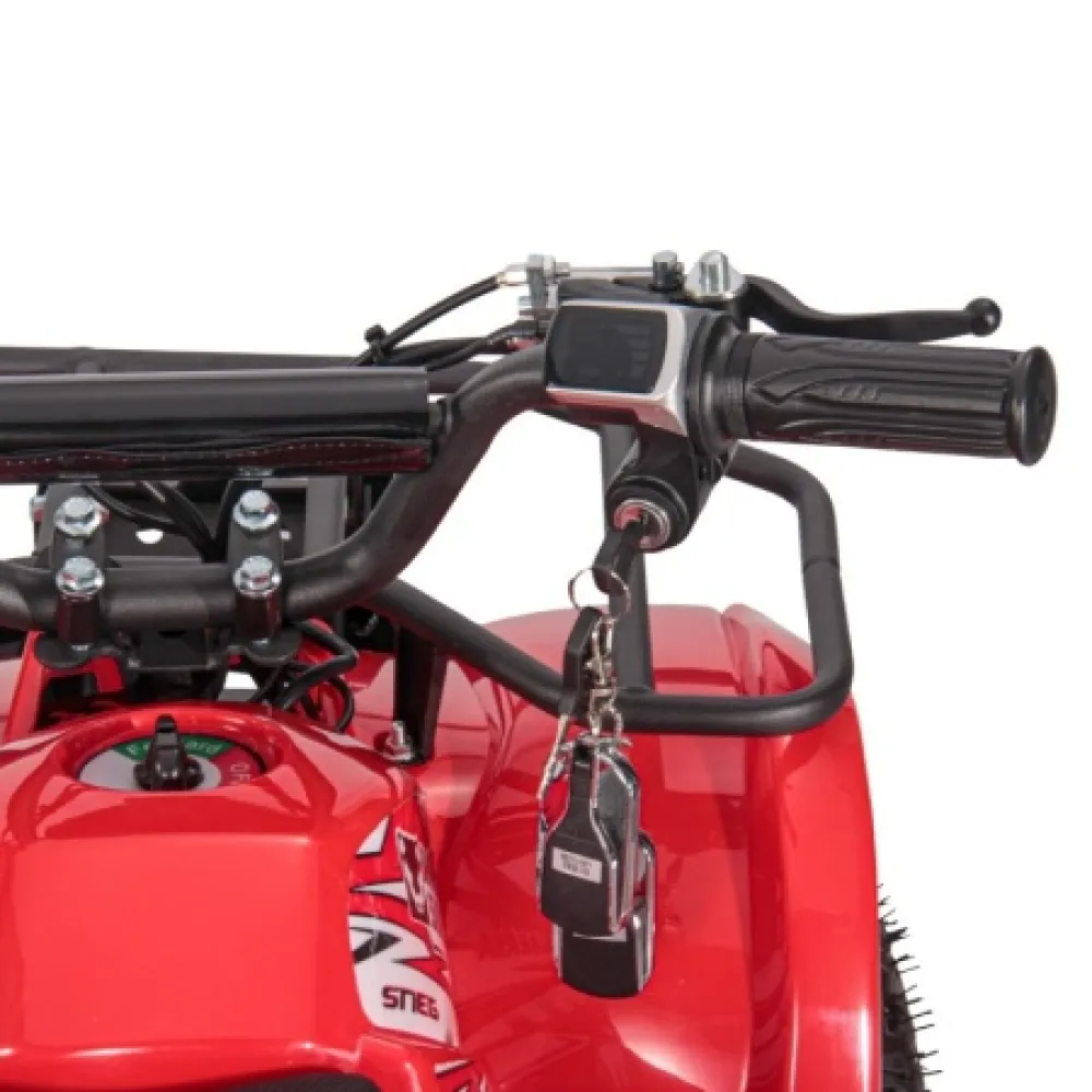 Электроквадроцикл устойчивый на ровной поверхности. Дает возможность максимального разгона, начального понимания скорости и участии в дорожном движении наравне с остальными райдерами. При мощностных параметрах электродвижка 1000 Вт максимальная скорость разгона достигает 25 км/час. Электроквадроцикл оснащен большой светодиодной фарой, разрешающей езду и развлечение подрастающего водителя в вечернее время и проблематичную погоду.