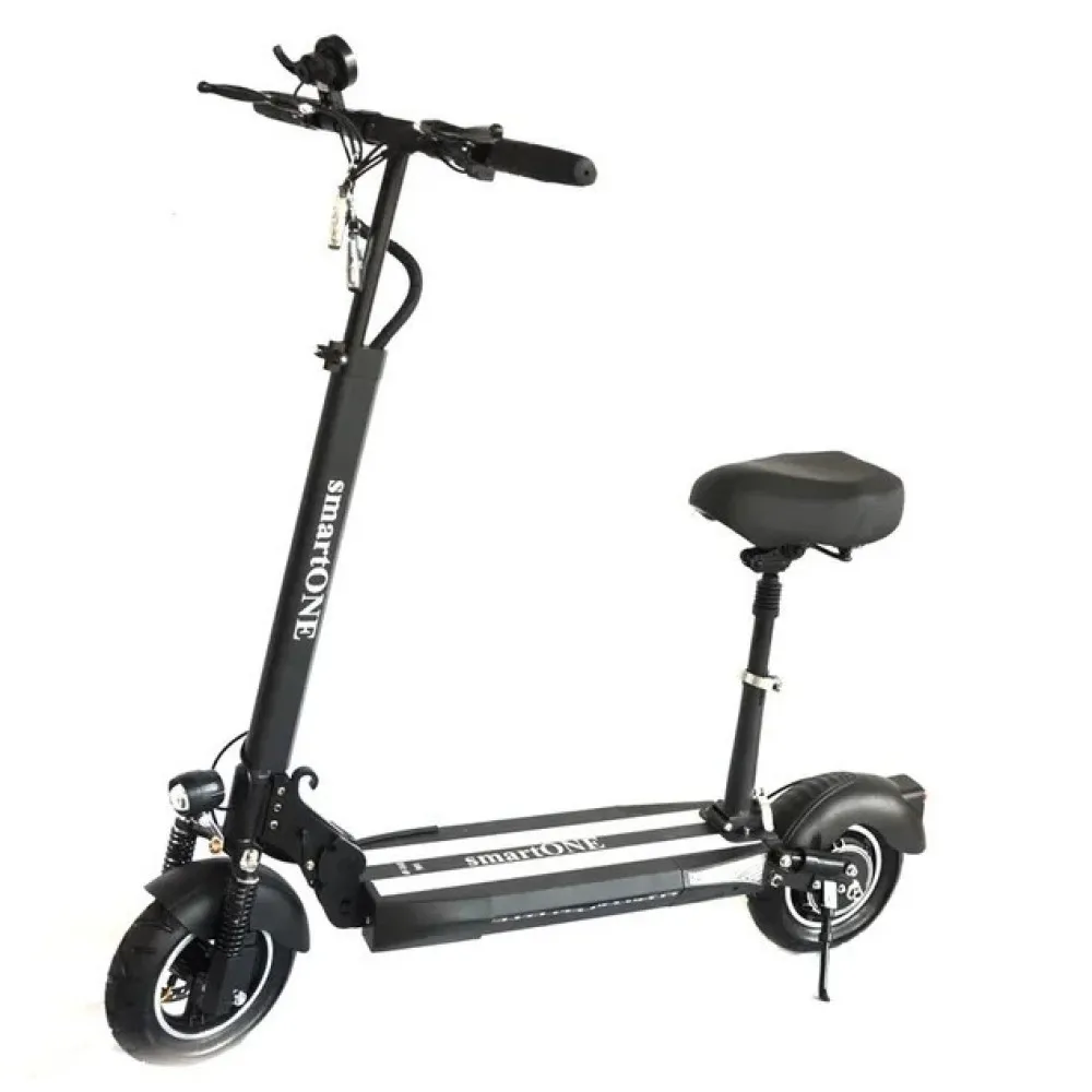 Электросамокат SmartOne MS-1 PRO мощный заднеприводный транспорт, который поможет каждый день преодолевать приличные расстояния. Его складная конструкция дает возможность в сложенном состоянии транспортировать его или убрать на хранение на зимнее время. Как дополнение, предусмотрено сидение. С комфортом совершать дальние прогулки вам будет на много проще. Руль регулируется под рост пользователя или под положение сидя.