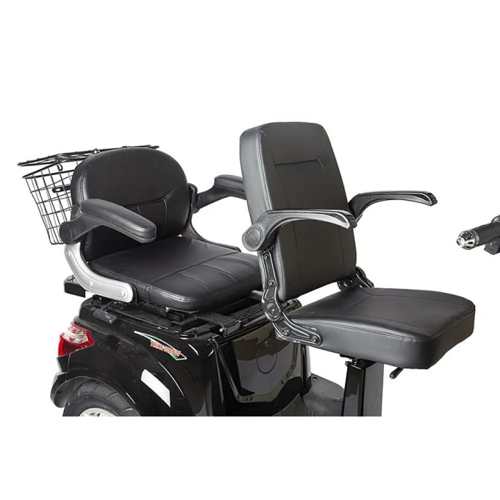 Трицикл оборудован вместительными комфортабельными сиденьями. Грузоподъемность составляет 130 кг при сухом весе 80 кг.