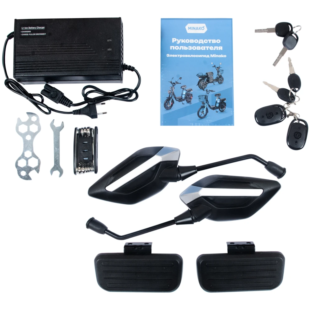 В комплекте: - мультитул для сборки - держатель для телефона - зарядное устройство - зеркала - передние поворотники - подножки для пассажира - сигнализация - доп.фары