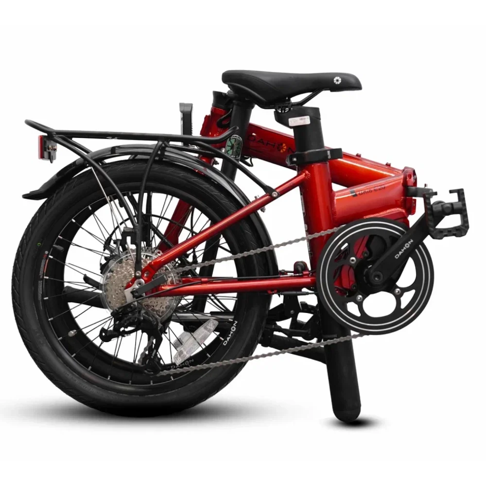 Складной электровелосипед DAHON UNIO E20 в красном цвете представляет собой легкий (12,2 кг) городской вариант с 20-дюймовыми колесами, подходящий для райдеров ростом 148-190 см. Алюминиевая рама обеспечивает прочность и компактность, делая его идеальным для ежедневных поездок и транспортировки в общественном транспорте. Модель сочетает механическую простоту с электрической поддержкой, фокусируясь на портативности без излишеств мощного мотора.