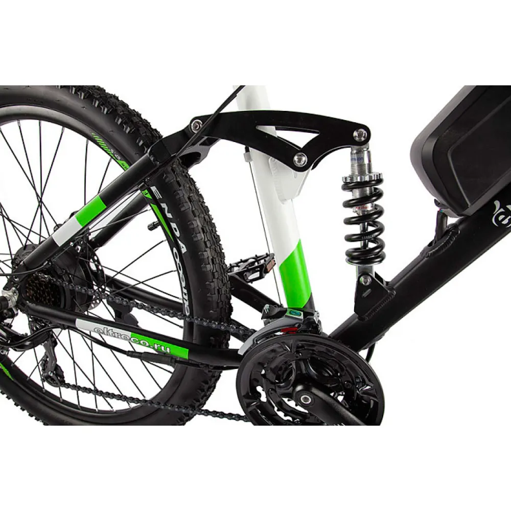 Фирменный двигатель мощностью 350Вт в совокупности с полностью заряженным Li-ion аккумулятором ёмкостью 10,4 Ah позволяют совершать поездки на расстояние до 50 км, двигаясь с максимальной скоростью в 35 км/ч. Велосипедная трансмиссия Shimano рассчитана на 21 скорость, что способствует комфортной проходимости горной, лесной и пересеченной местности.