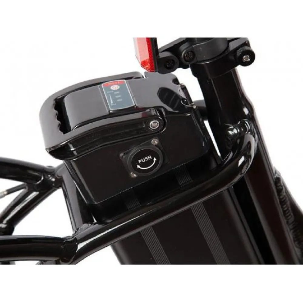 Электровелосипед Eltreco Good Lux оборудованный двигателем мощностью 250 Вт. Агрегат достаточно маневренный. Транспортное средство может развивать максимальную скорость 25 км/ч. Он рассчитан на передвижение по относительно ровным дорожным покрытиям, у него жесткая подвеска. Ободная тормозная система позволяет чувствовать себя спокойно в потоке движения. Литий-ионный аккумулятор имеет емкость 7 А*ч, полного заряда батареи хватает на 35 км пути. Зарядное устройство идет в комплекте с электровелосипедом, его необходимо подключить на 5 часов для пополнения заряда на 100 процентов. Диаметр колес 20 дюймов.