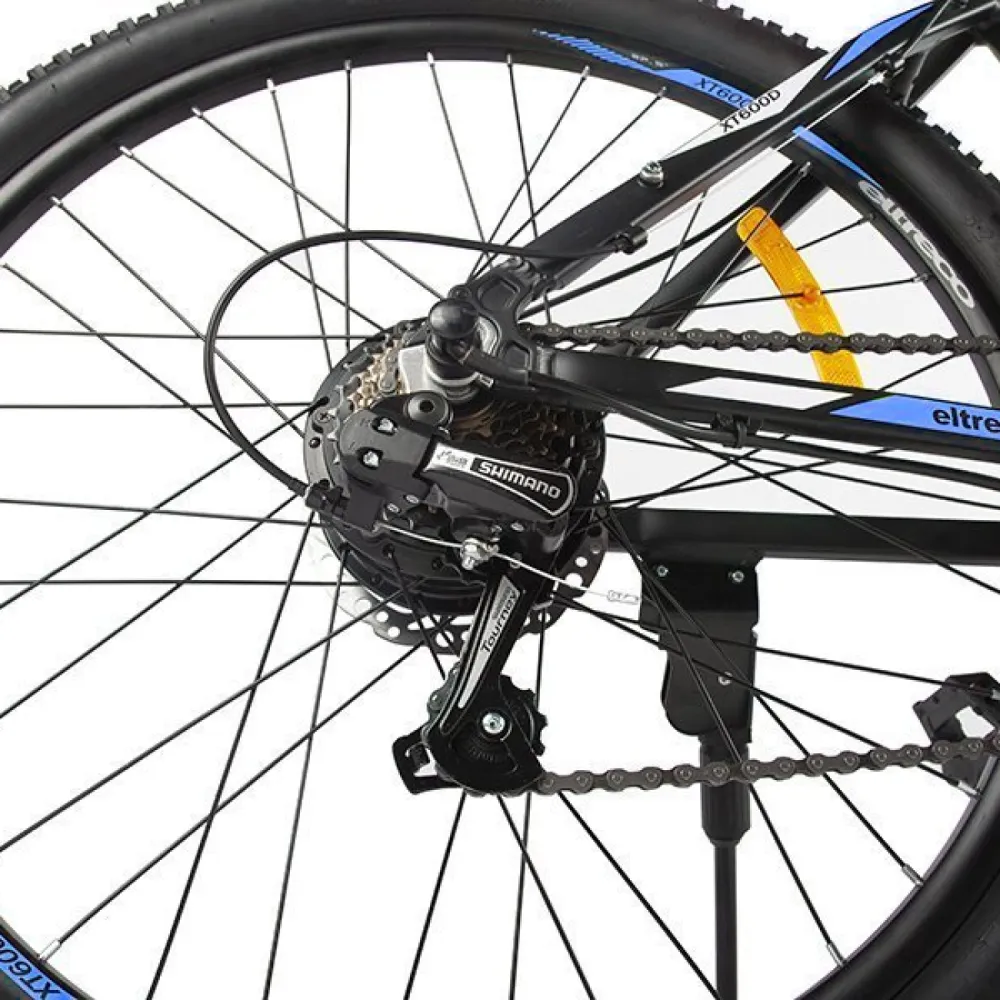 Велогибрид Eltreco XT 600 – доступная и востребованная на рынке электровелосипедов модель. В сравнении с предыдущими вариантами имеет облегченную алюминиевую раму, сглаженную геометрию, в которой нельзя найти острых углов. черно-синяя модель велосипеда сочетает в себе роскошь и многофункционал. Общий вес велика – 20 кг. При разработке модели производитель использовал оригинальные брендовые запчасти, что сделало срок службы техники длительным. Технические особенности электровелосипеда следующие: