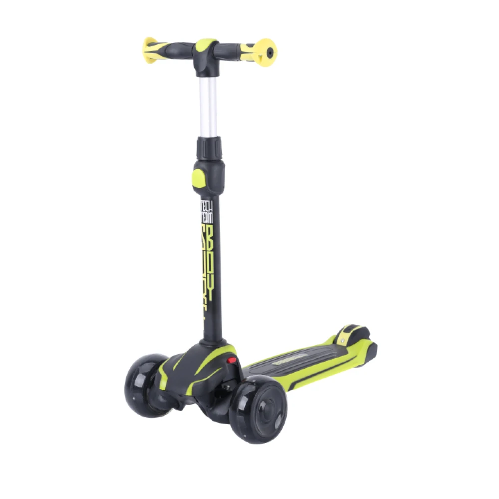 Рукоятка имеет удобные формы и прорезиненную экологически чистую поверхность. Препятствует соскальзыванию ручек. Минимизирует риск неудобств и падения ребенка. Колеса – полиуретановые, большие. Передние и задние представлены размерами 120*50 и 80*50 мм соответственно. Самокат оснащен современными подшипниками и амортизаторами, гарантирует отличный накат, не взывает дискомфорта при пересечении каменистой местности. Во время езды включается светодиодная подсветка, делающая технику более привлекательной.