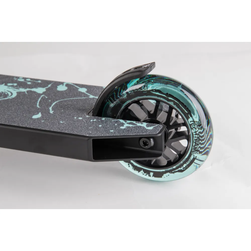 Качественная колесная часть с черно-бирюзовыми полиуретановыми колесами способна сотворить чудеса, выполнять рискованные трюки слушаясь пользователя на 100 %.