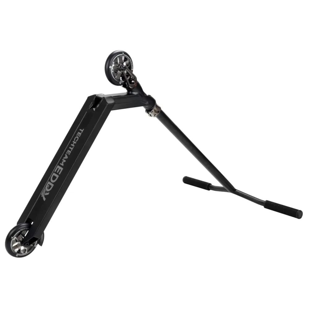 Новейшая алюминиевая вилка IHC-компрессии оснащена зажимом из двух болтов соединяющих с рулем из закалённой "хромолевой" стали в диаметре 31,8 мм в классической форме «крылья чайки». Диск у колеса из алюминия средней жесткости 88 A, диаметр 110 мм и ширина 24 мм выполнены из высочайшего по качеству полиуретана с технологией "Super High Rebound". Благодаря технологии отскок резкий и высокий. Модель выпускается в черном окрасе есть с вариацией зажима вместе с вилкой «нео-хром» на анти скользящем покрытии есть фирменный дизайнерский элемент отображающий название модели, так-же на абортной стороне деки есть надпись. Eddy очень стильный и качественно выполненный помошник, инженерные решения очень прогрессивны и смелы. Данная модель преставлена в полностью черном исполнении.