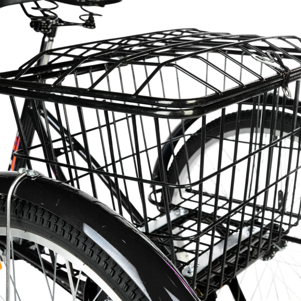 В комплекте: велосипед, насос, ключи, передняя/задняя корзины (до 15/50 кг, с замком сзади), крылья с усилителями, упоры на руле. Дополнительно: замок, фонари; апгрейдов официальных нет, совместим с универсальными (корзины, седла от других брендов).